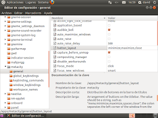 - Buscamos la opción button-layout (apps-->metacity-->general-->button-layout)