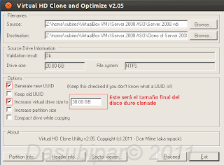 Una vez descargado, lo descomprimimos y ejecutamos "cloneDVI.exe". Ahora seleccionamos en Filenames, source, browse el disco duro que queremos clonar, y en destination donde queremos que se cree el disco clonado.En las options marcamos los checkbox "Generate new UUID" y "Increase virtual drive size to"..... añadiendo el tamaño que tendrá finalmente el disco duro clonado y por último pulsamos proceed y esperamos algunos minutos.